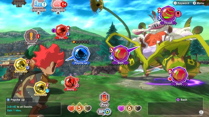While built on a fascinating concept, the combat feels like it's been overdesigned. It's part deck builder, part board game (think like a Mario Party layout). It's a battle system that seems like it was conceived in a child's imagination, at once adorable and ludicrous. You have the cutely named "Izzits," ideas for moves that haven't materialized yet, and "Dazzits," what they turn into when you activate an Izzit. Activating an Izzit costs a certain amount of stones, and at the start of every match, you have just three of 'em. After three turns, that number goes up to four, until it eventually caps out at six action points you can spend per turn on your Izzits. Your cards are split into three categories; red is attack, yellow is defense, and blue is some sweeping perk, whether it boosts all your cards or attacks the enemy's.