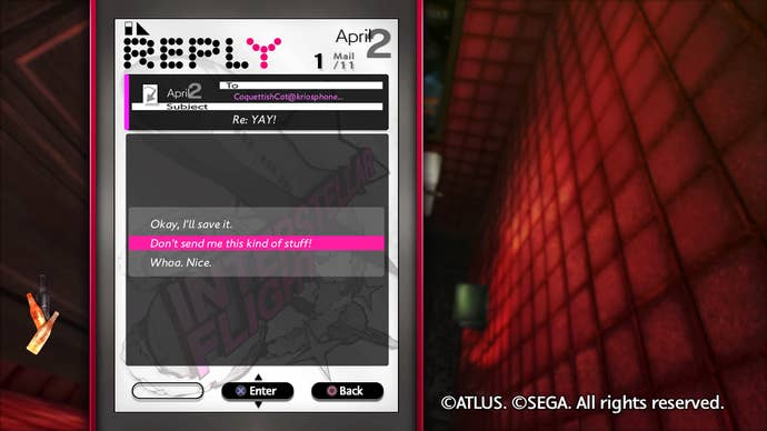 Catherine still has lots of style, and a great Shoji Meguro soundtrack to boot. (Side note: All native screenshot captures have an obnoxiously large trademark, which tends to overlap with most subtitles. Something to keep in mind when you share your Catherine moments on Twitter!) | Caty McCarthy/USG, Studio Zero/Atlus