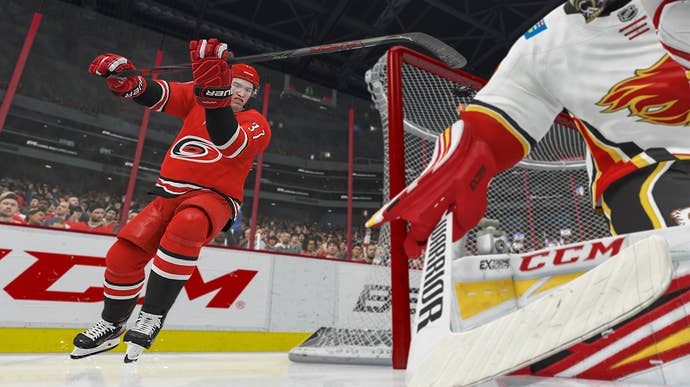 Alas, I've soured a bit on NHL's gameplay overall, especially when playing with the computer. When the A.I. is around, NHL feels somehow more robotic, its lantern-jawed players bumping awkwardly as they try to cycle the puck. A scrum in front of goal feels like a slow-rolling car wreck as players pile up around the net.